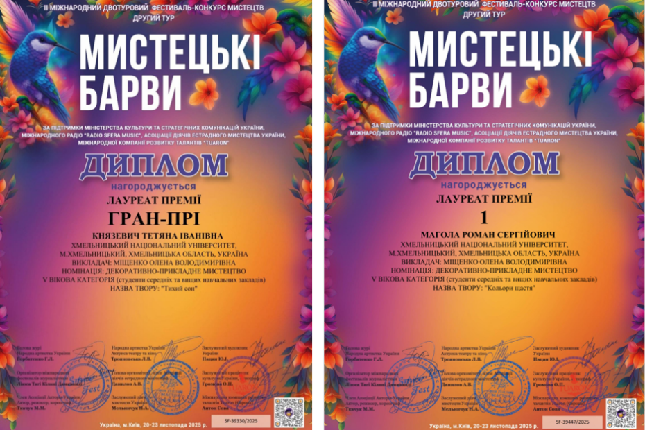 Вітаємо здобувачів ОПП «Середня освіта. Технології та інформатика» з перемогою у ІІ Міжнародному двотуровому фестивалі-конкурсі мистецтв “Мистецькі барви”, м. Київ 20-23 листопада 2025 р