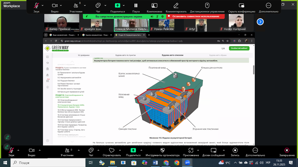 Лектор розповів про види автомобільних акумуляторних батарей. Особливості їх будови та принцип роботи. Особливу увагу було приділено правилам експлуатації акумуляторних батарей, та можливим несправностям.