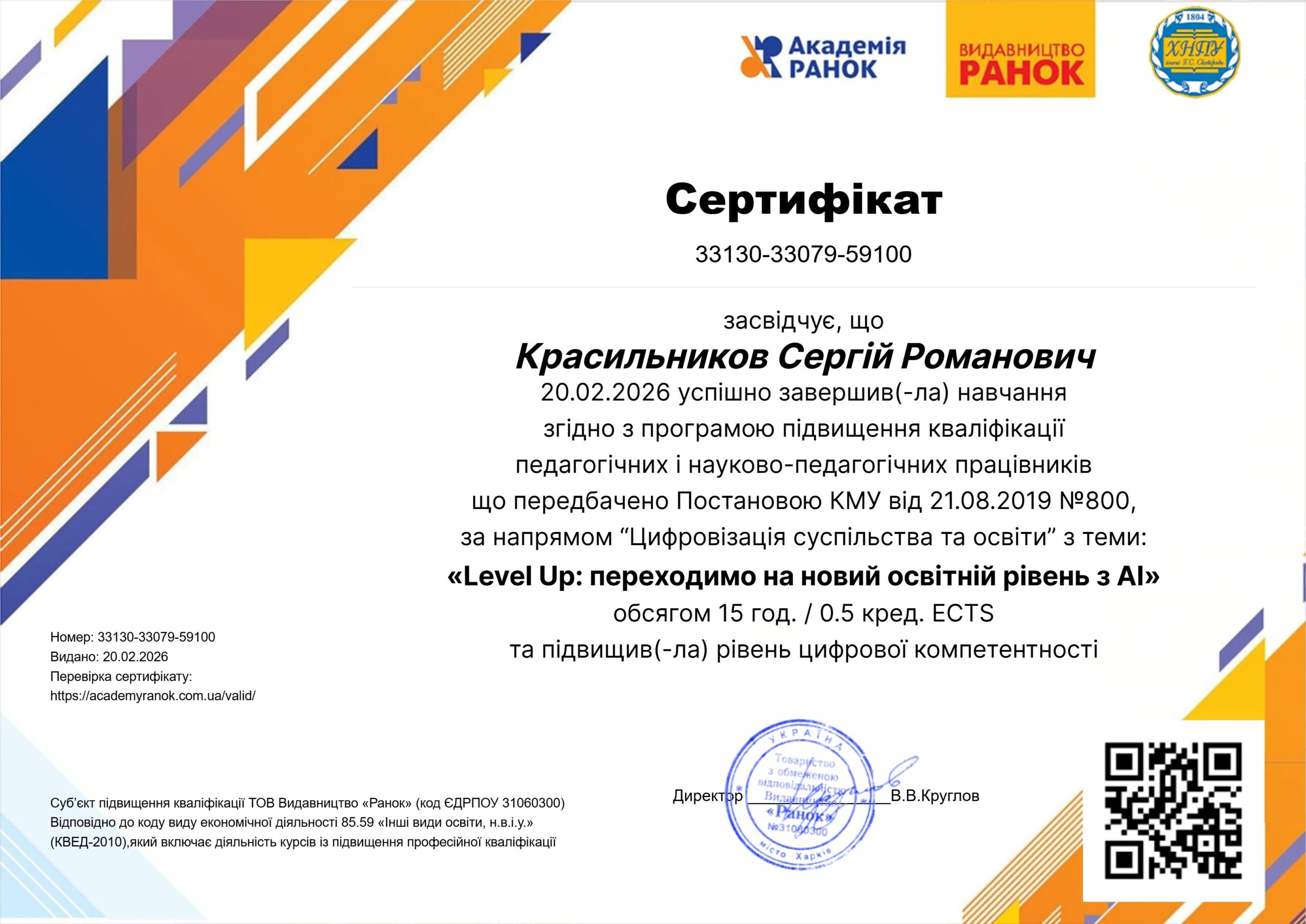 - зимовий інтенсив за темою «Level Up: переходимо на новий освітній рівень з АІ». Захід організовано Видавництвом «Ранок» та Харківським національним педагогічним університетом імені Г. С. Сковороди 17-18 лютого 2026 року (0,5 кр. ЄКТС). Сертифікат 33130-33079-59100