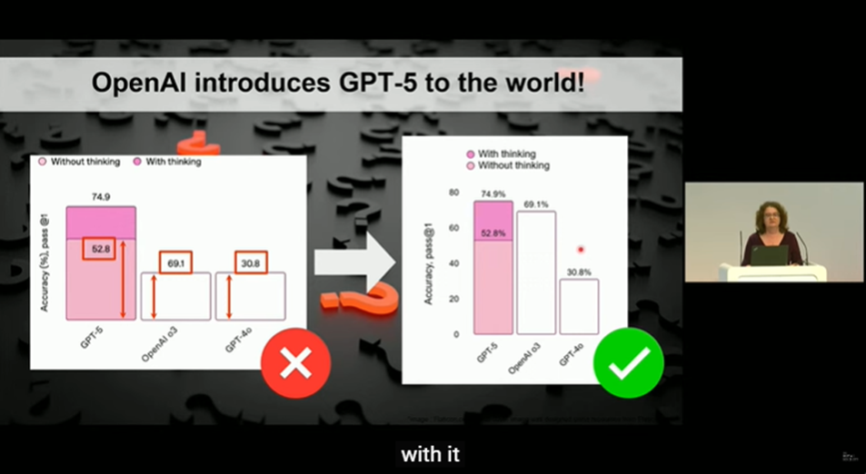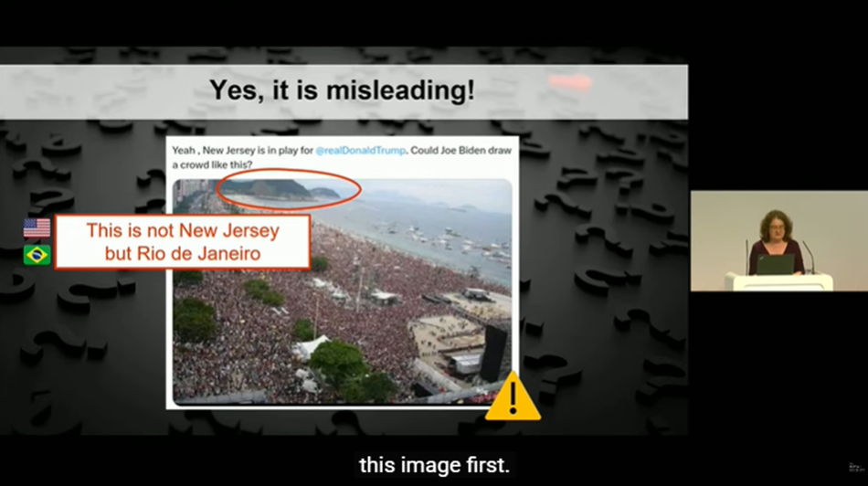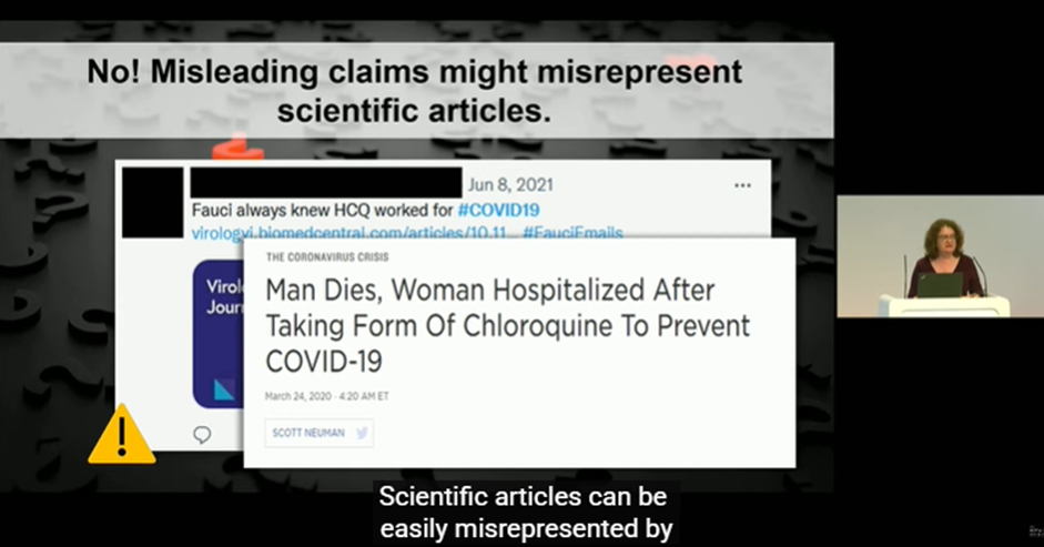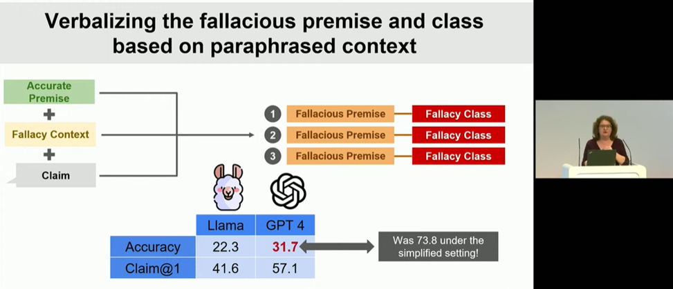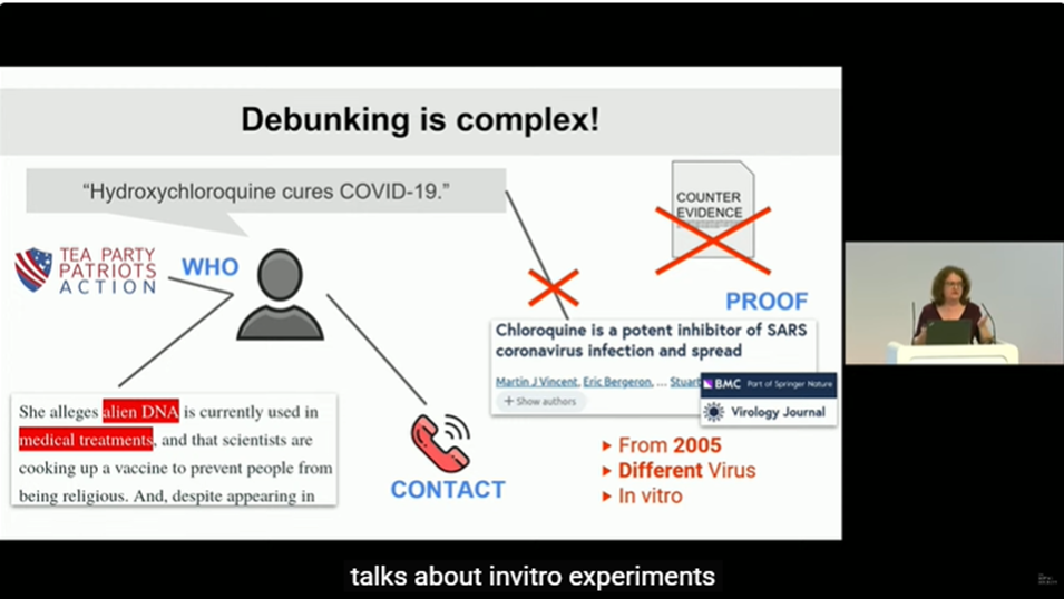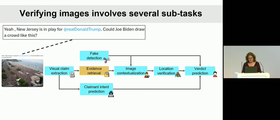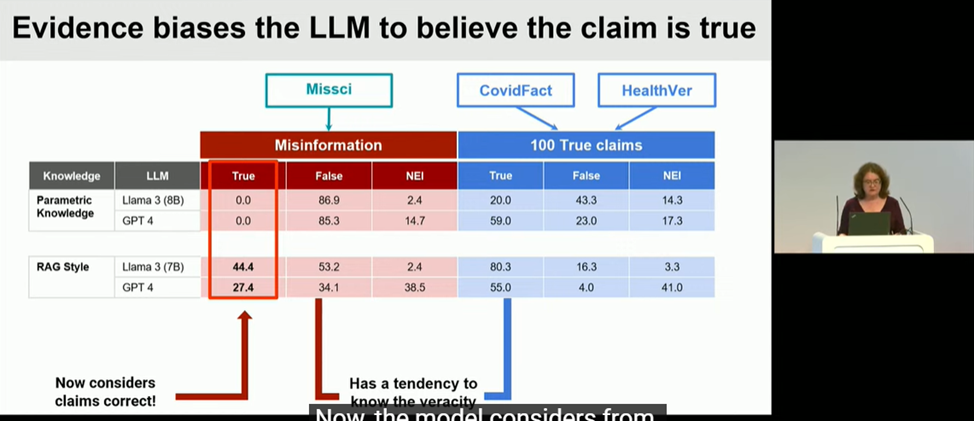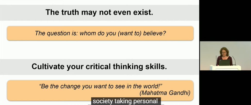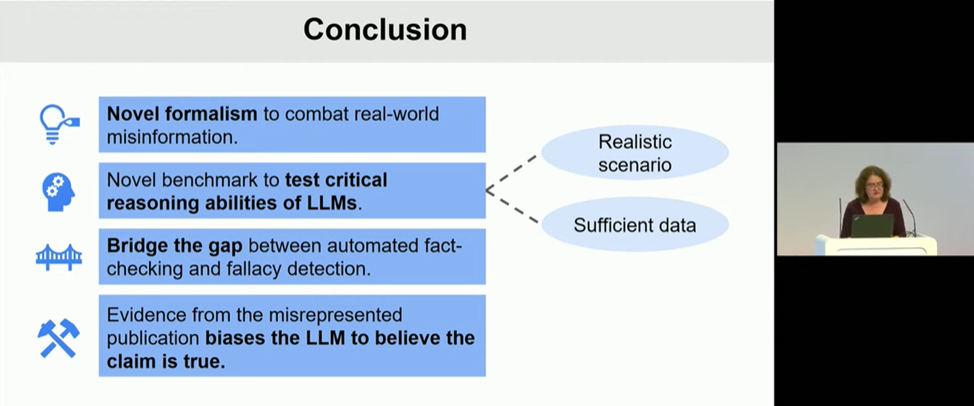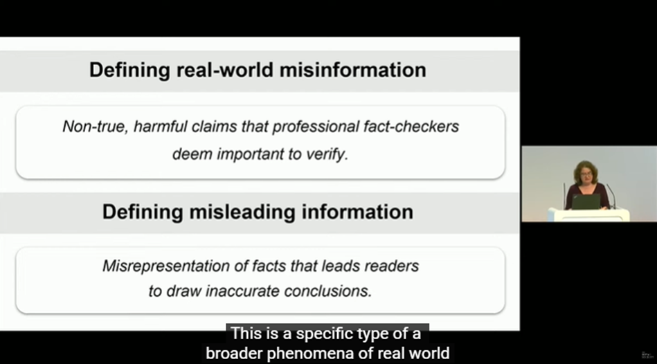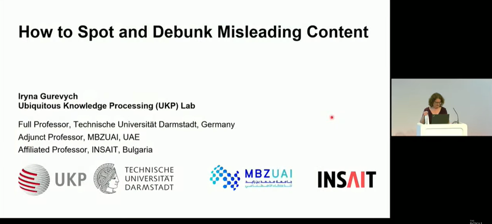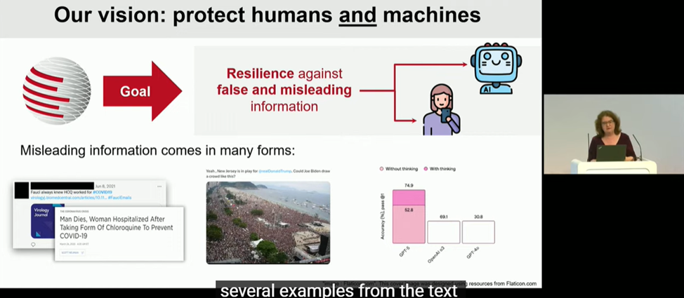 В умовах стрімкого зростання обсягу інформації, яку генерує штучний інтелект, користувачі нерідко стикаються з недостовірним, оманливим контентом, який потребує додаткової перевірки перед його використанням. Пані професорка навела приклади оманливого контенту у вигляді неправдивих тверджень в соціальних мережах, підкріплені неправильним використанням авторитетних наукових публікацій, зображень та відео, вирвані з контексту та поєднані з неправдивими наративами та ін. Вона ознайомила слухачів ознайомила аудиторію з тактиками, що використовуються для створення оманливого контенту, та продемонструвала, як останні досягнення в галузі машинного навчання та штучного інтелекту можуть бути застосовані для захисту як людей, так і машин від дезінформації.