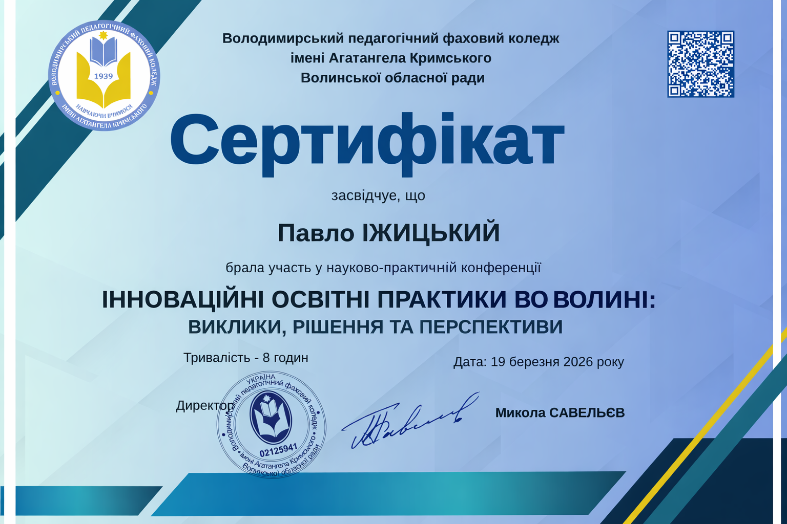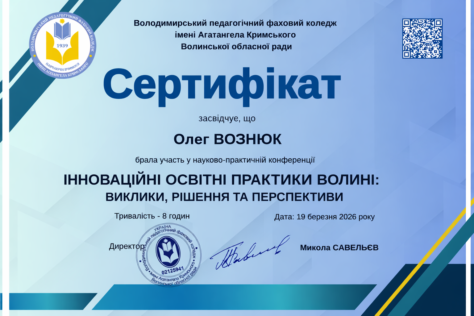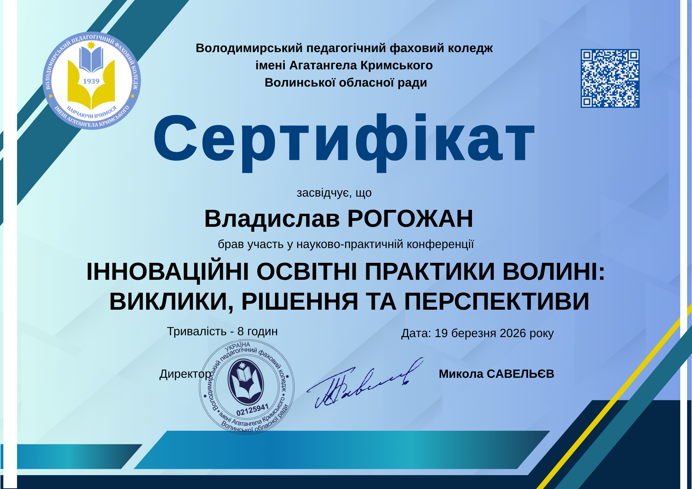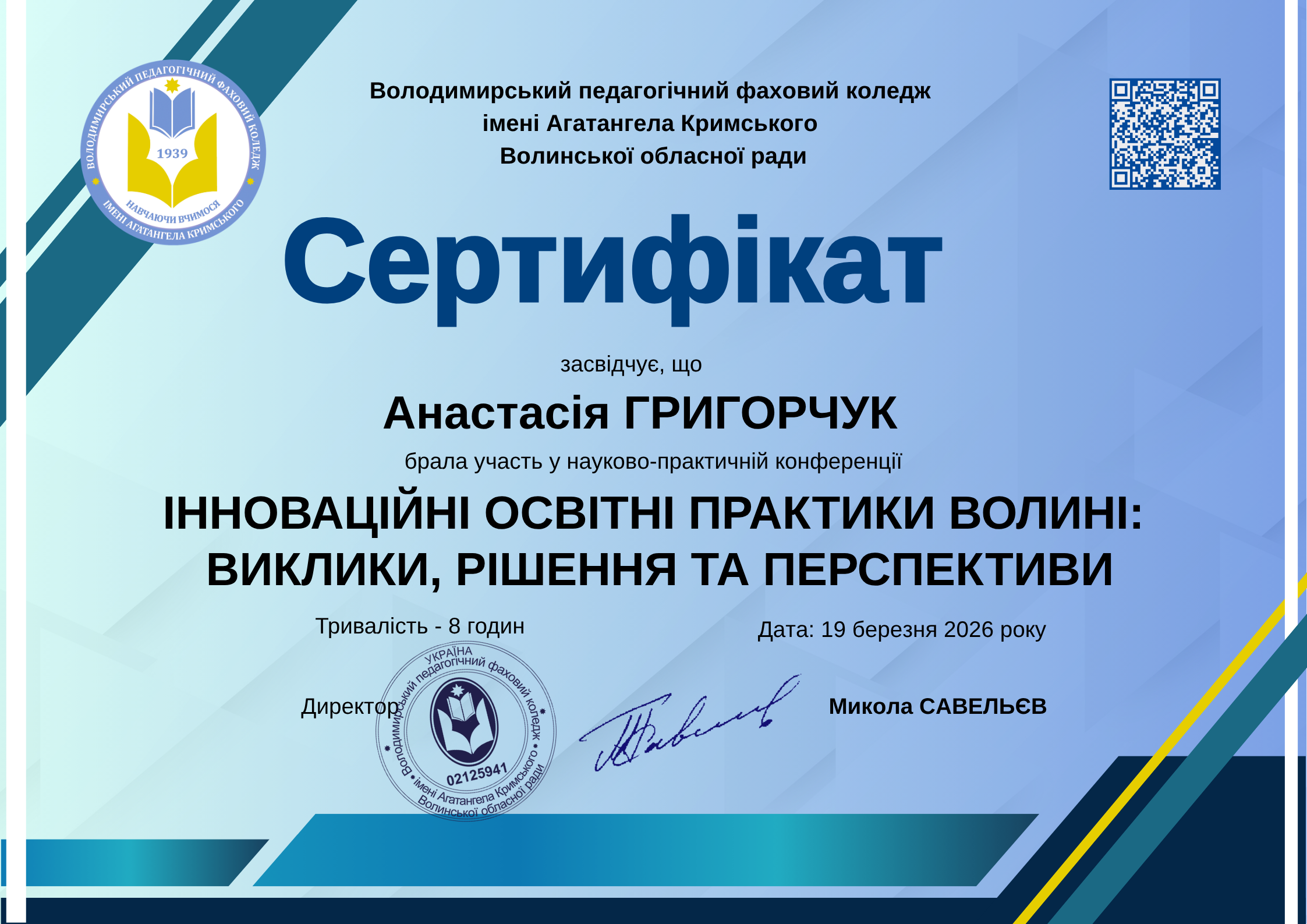 Науково-практична конференція “ІННОВАЦІЙНІ ОСВІТНІ ПРАКТИКИ ВОЛИНІ В УМОВАХ ВОЄННОГО СТАНУ” (Володимирський педагогічний фаховий коледж імені Агатангела Кримського Волинської обласної ради, 15 січня 2025 року) .