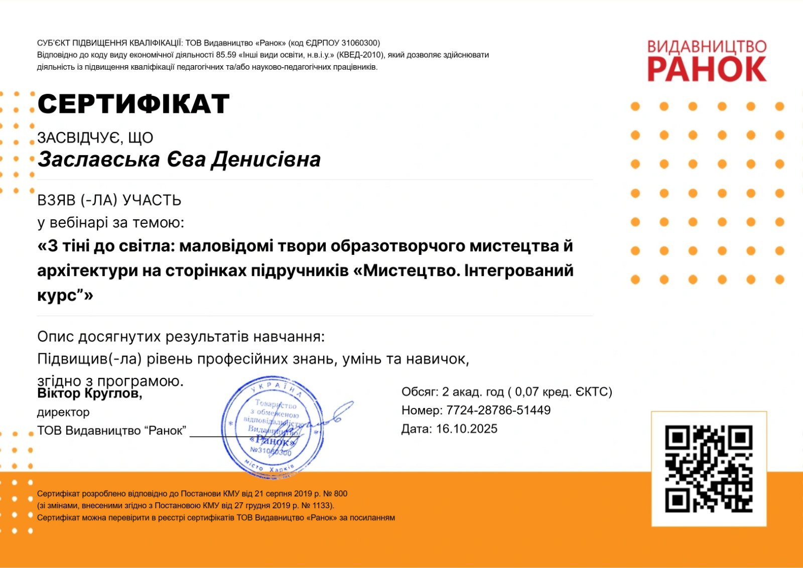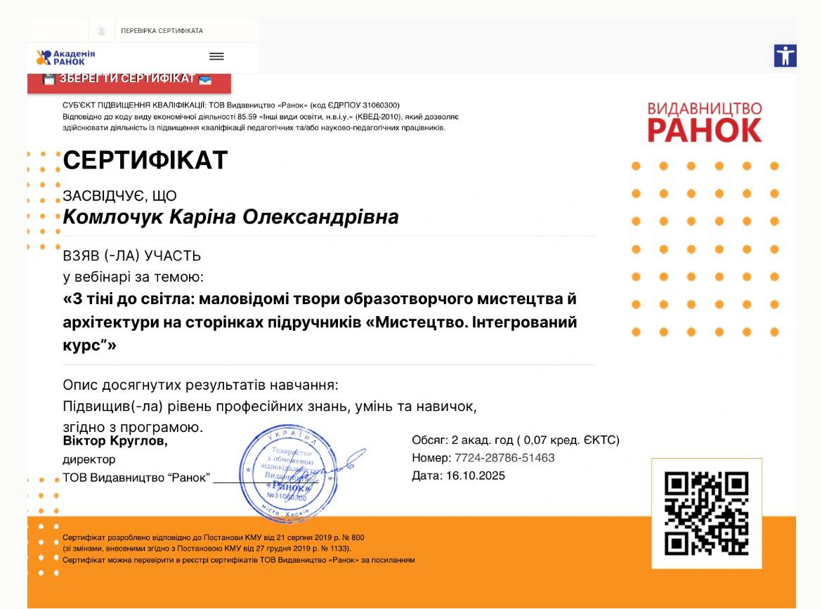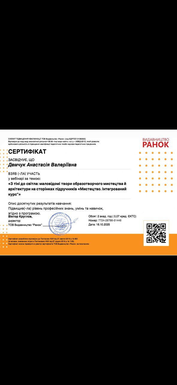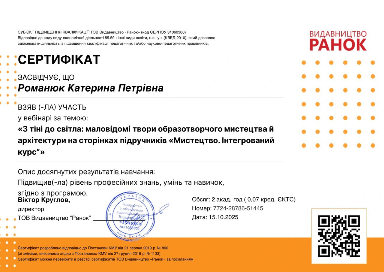 Результати участі у вебінарі «З тіні до світла: маловідомі твори образотворчого мистецтва й архітектури на сторінках підручників “Мистецтво. Інтегрований курс”» від ТОВ видавництво «Ранок» (16.10.2025)