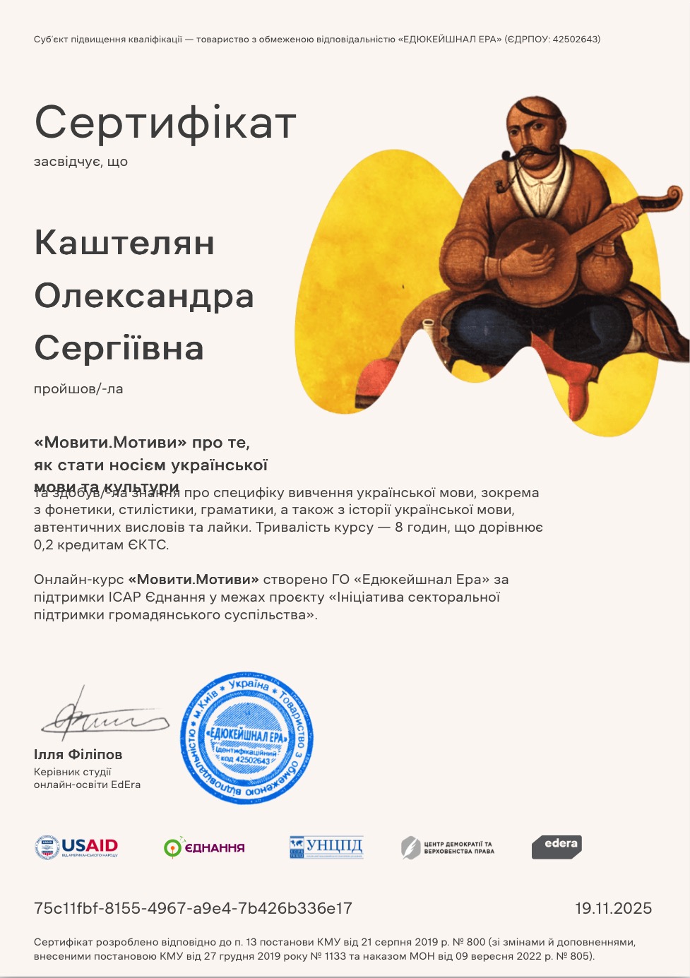 Результати проходження Онлайн-курсу «Мовити.Мотиви» створеного ГО «Едюкейшнал Ера» за підтримки ICAP Єднання у межах проєкту «Ініціатива секторальної підтримки громадянського суспільства»(19.11.2025)