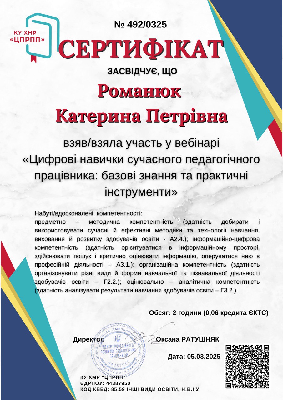 Результати участі у вебінарі “Цифрові навички сучасного педагогічного працівника: базові знання та практичні інструменти” (2025 р.)