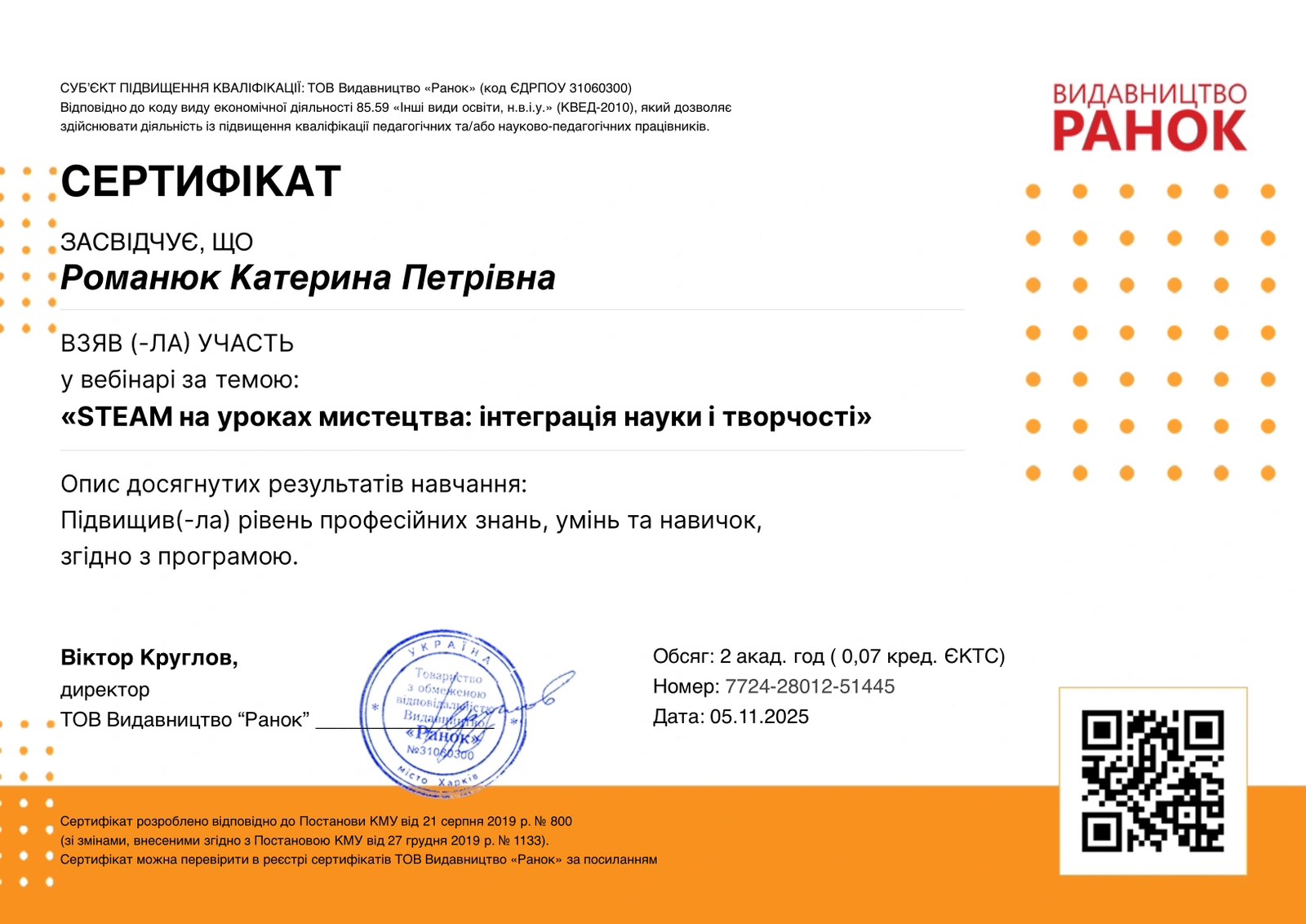 Результати участі у вебінарі за темою: «STEAM на уроках мистецтва: інтеграція науки і творчості» від ТОВ видавництво «Ранок» (05.11.2025)