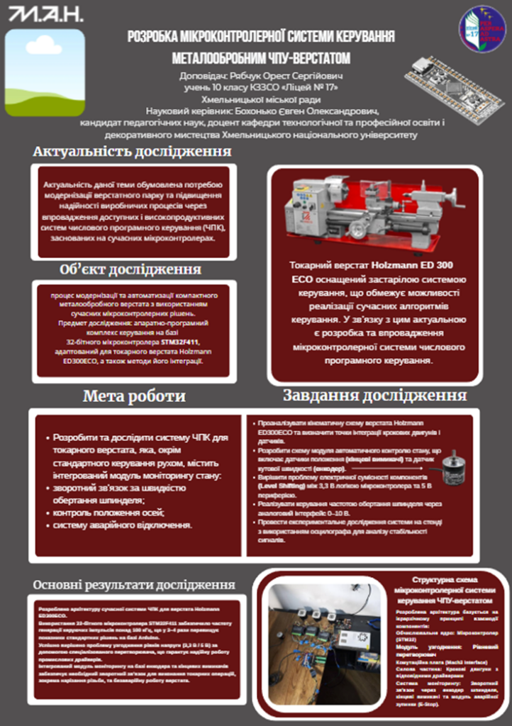На конкурс була представлена науково-дослідницька робота на тему «Розробка мікроконтролерної системи керування металообробним ЧПУ-верстатом», у якій продемонстровано високий рівень інженерного мислення, практичної підготовки та вміння застосовувати сучасні технології в галузі електроніки та автоматизації.