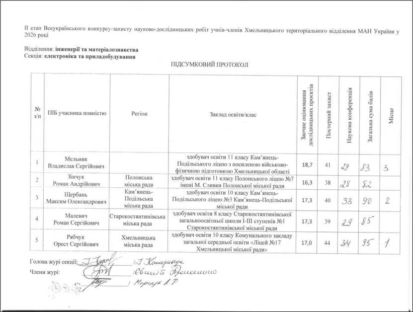 За підсумками ІІ (обласного) етапу конкурсу-захисту науково-дослідницьких робіт Малої академії наук України Рябчук Орест, учень 10–Б класу Ліцею № 17 Хмельницької міської ради виборов І місце у науковому відділенні інженерії та матеріалознавства, секції електроніка та приладобування. Різні етапи конкурсу відбулися 28 лютого та 7 березня 2026 року.