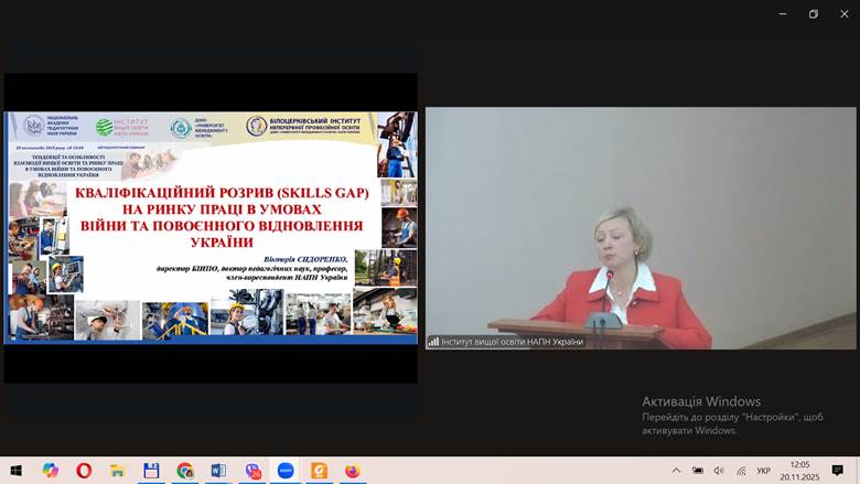 - «Кваліфікаційний розрив (skills gap) на ринку праці в умовах війни та повоєнного відновлення України» Сидоренко Вікторія Вікторівна, директора Білоцерківського інституту неперервної професійної освіти ДЗВО «Університет менеджменту освіти» НАПН України, доктора педагогічних наук, професор, члена-кореспондента НАПН України;