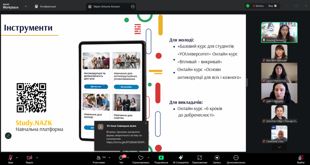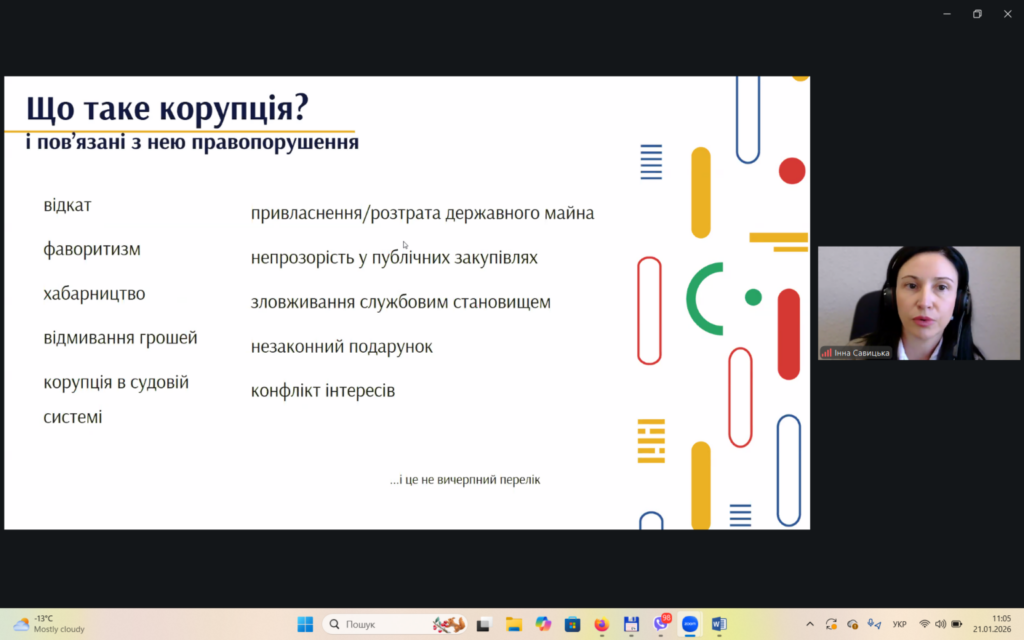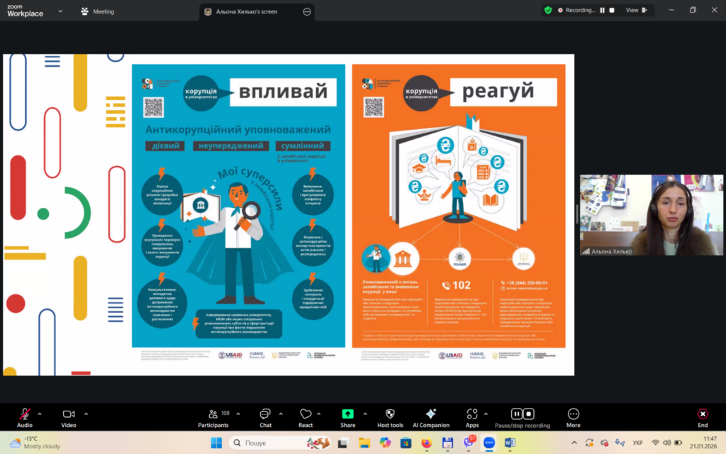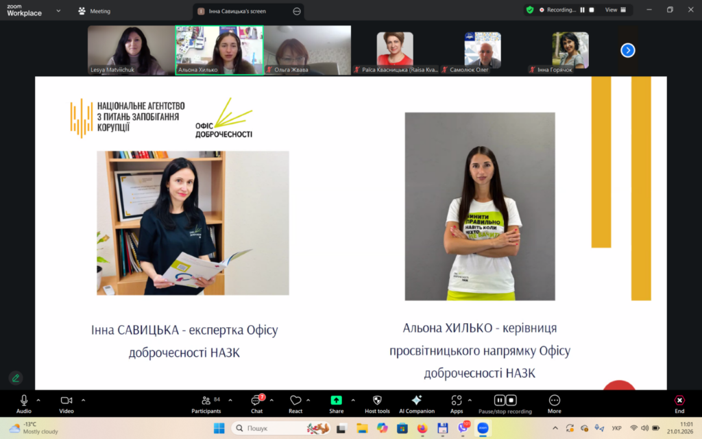 У першій частині вебінару Інна Савицька висвітлила проблему корупції та пов’язані із нею правопорушення. У другій частині заходу Альона Хилько зосередила увагу на питаннях доброчесності як ключової складової освітнього процесу.