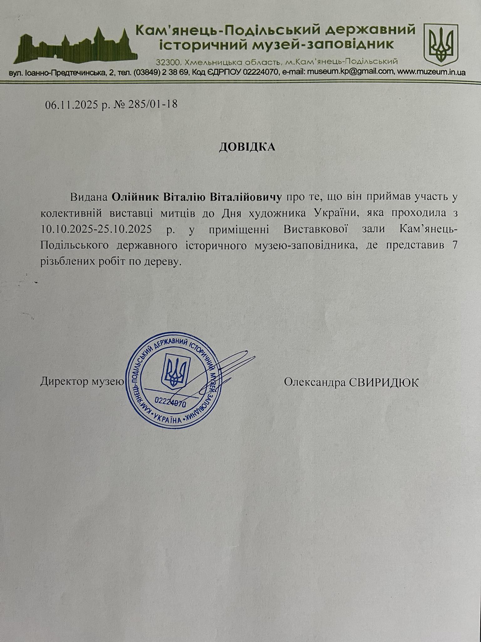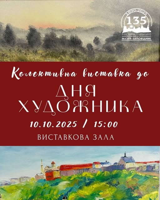 У виставковій залі Кам’янець-Подільського державного історичного музею-заповідника пройшла Колективна виставка до Дня художника України, яка тривала з 10.10.2025 р. по 25.10.2025 р. На виставці було представлено близько півсотні робіт у різних техніках, зокрема: живопис, графіка, витинанка, квілт, а також вироби з деревини та прикраси.