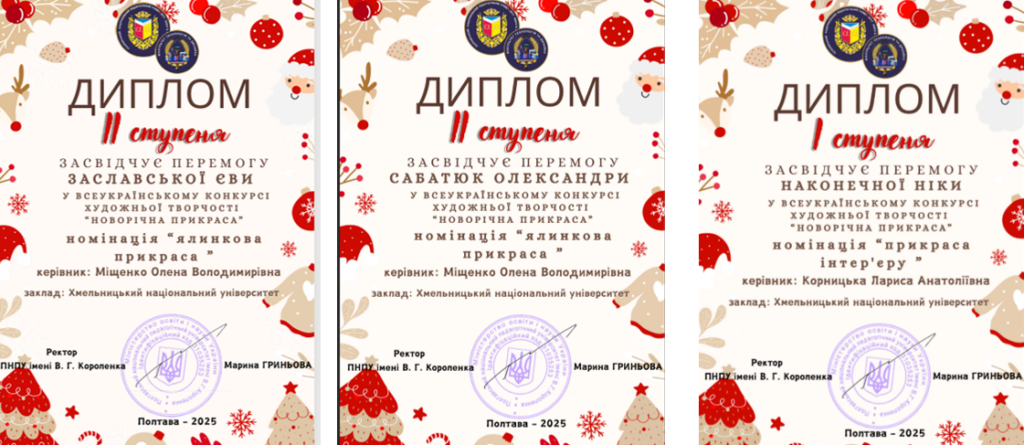 Здобувачі ОП «Образотворче мистецтво. Декоративне мистецтво» Наконечна Ніка (ст. гр. ДМ-22-1), Заславська Єва (ст. гр. ДМ-24-1) та Сабатюк Олександра (ст. гр. ДМ-24-1) прийняли участь у Всеукраїнському дистанційному конкурсі художньої творчості «Новорічна прикраса», у номінації «ялинкова прикраса».