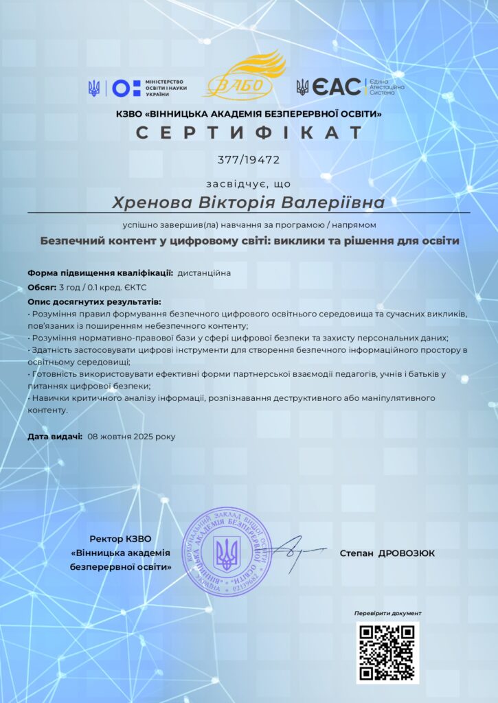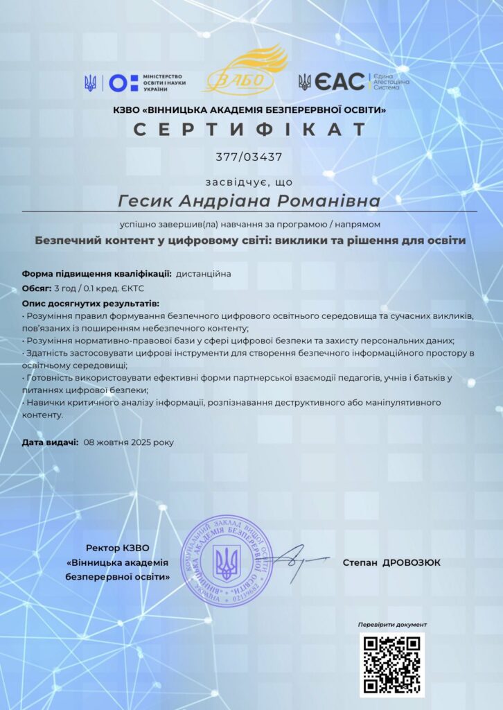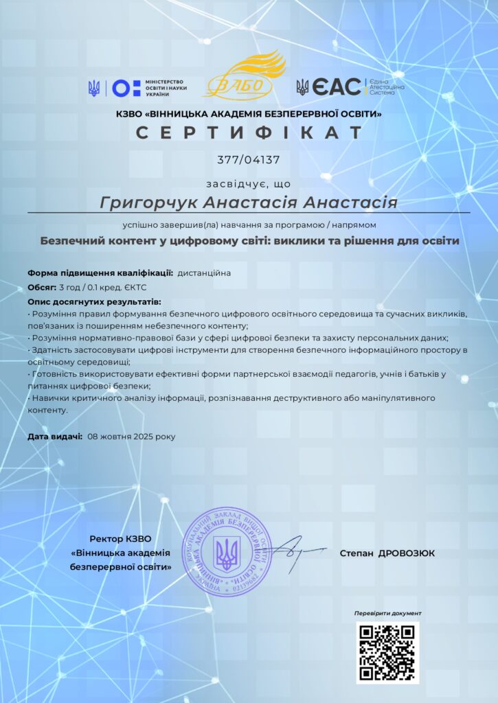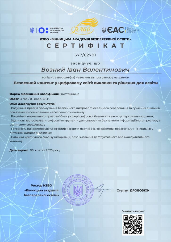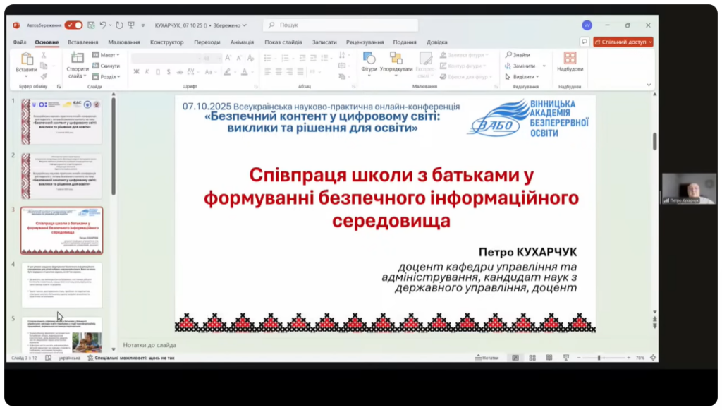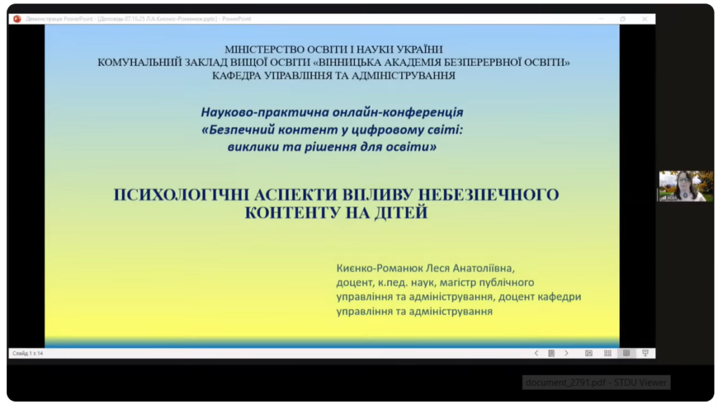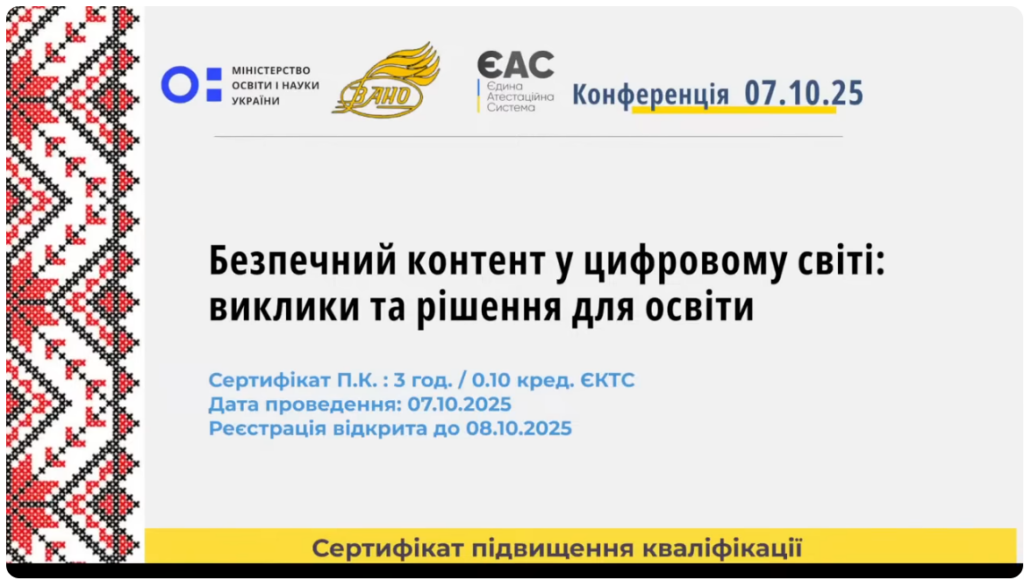 7 жовтня 2025 року здобувачі другого (магістерського) вищої освіти за ОПП “Середня освіта. Технології та інформатика” та викладачі кафедри технологічної та професійної освіти і декоративного мистецтва у взяли участь у Всеукраїнській онлайн-конференції “Безпечний контент у цифровому світі: виклики та рішення для освіти”.