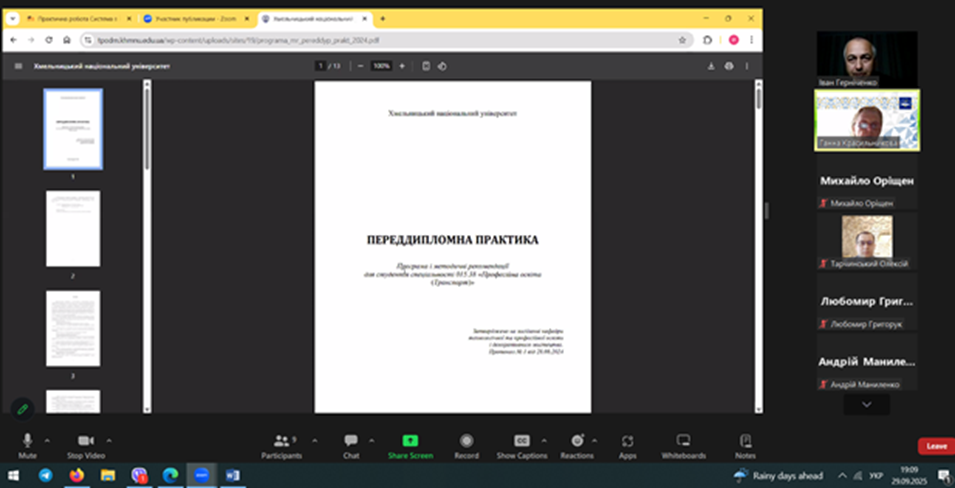 29 вересня 2025 року відбулася настановча конференція з переддипломної практики для здобувачів магістерського рівня вишої освіти спеціальності «Професійна освіта (за спеціалізаціями)» групи ПОтм-24-1 та ПОшмз-24-1.