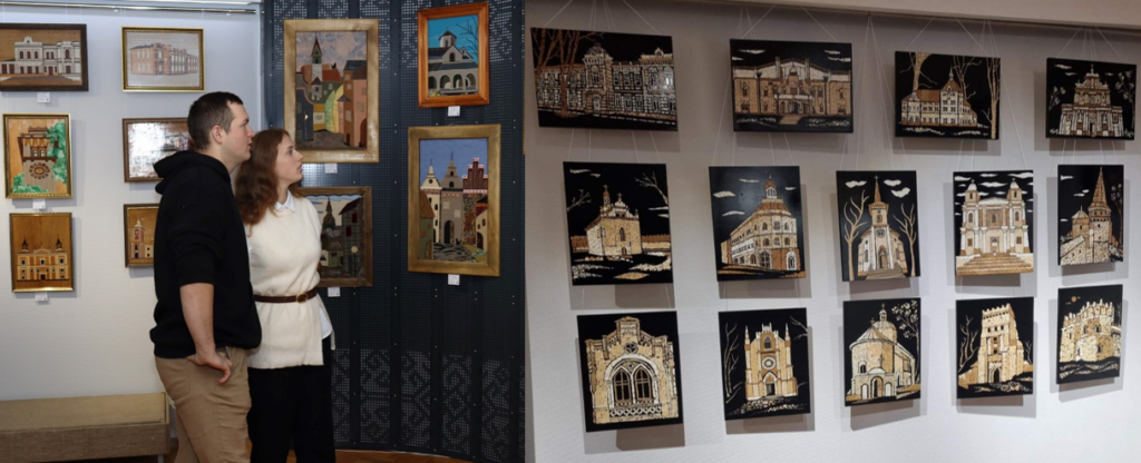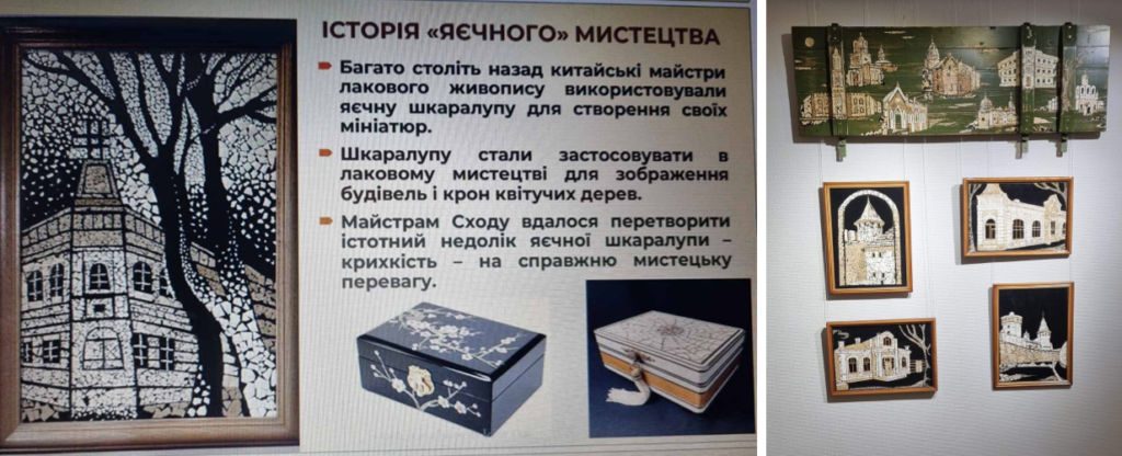 Архітектура – це відлуння різних часів, в якій закарбовано історію та культуру народу. На виставці представлено понад 50 картин, створених з нетрадиційних матеріалів, зокрема: яєчної шкаралупи – техніка «кракле», шматочків деревного шпону – техніка «маркетрі» та клаптиків тканини – аплікативна техніка – «текстильна графіка». На картинах старовинні споруди: фортеці, палаци, храми, приватні садиби, які представляють різні історичні часи та стилі.