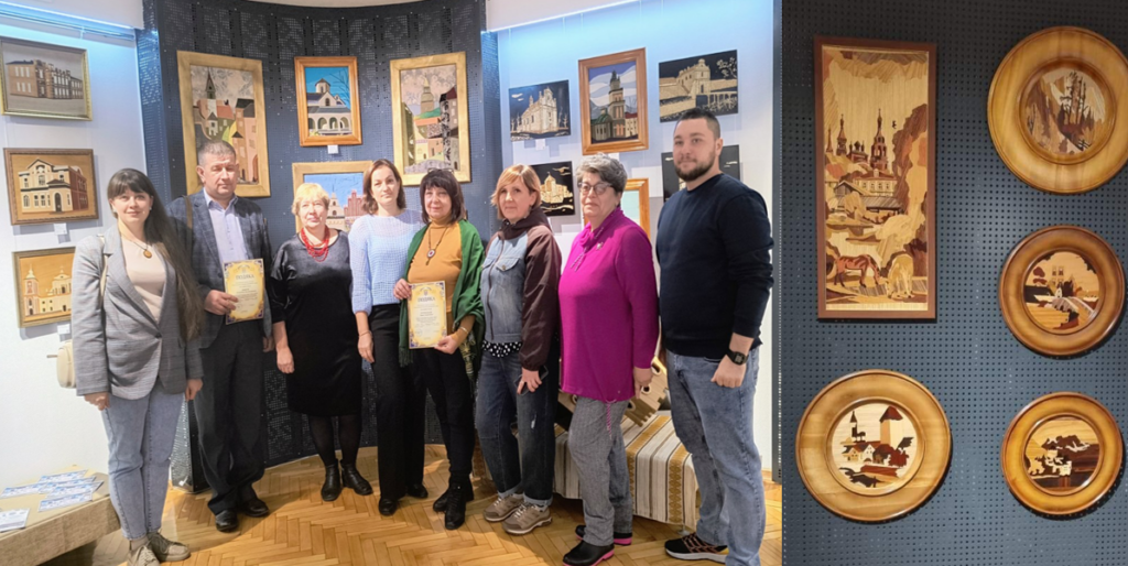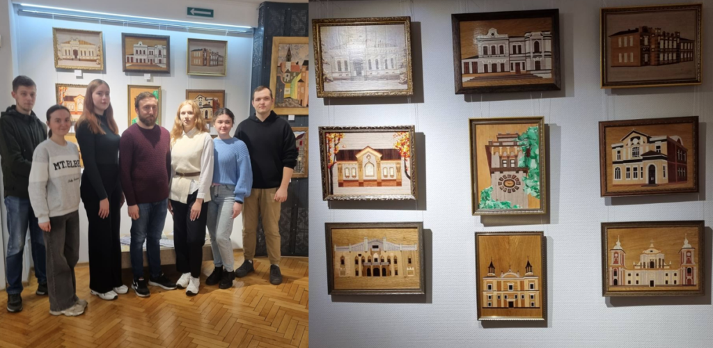 Архітектурні роботи в техніці «маркетрі» виконувалися здобувачами груп СОТм-24-1, ТН-22-1, ТН-23-1, під керівництвом кан. пед. наук, доцента Олександра ЛІВШУНА, за ескізами молодої художниці, веб-дизайнерки Юлії ТРІМАСОВОЇ, яка створює ексклюзивні акварельні листівки з зображенням історичних будівель Хмельницького, задля збереження його архітектури та формування локальної ідентичності у містян. Задум Юлії створити листівки, які передавали б візуальний образ міста з акцентом на його історії. Хмельницький має не лише речовий ринок, тут чимало архітектурної спадщини та будівель, які зберегли свою автентичність. Маркетрі – це вид художньої інкрустації по дереву, а також готова мозаїчна композиція, що створюється з тонких шматочків шпону різних порід деревини, які вирізаються за візерунком та кольором й наклеюються на фонову поверхню, утворюючи вишукані орнаменти чи сюжетні зображення.
