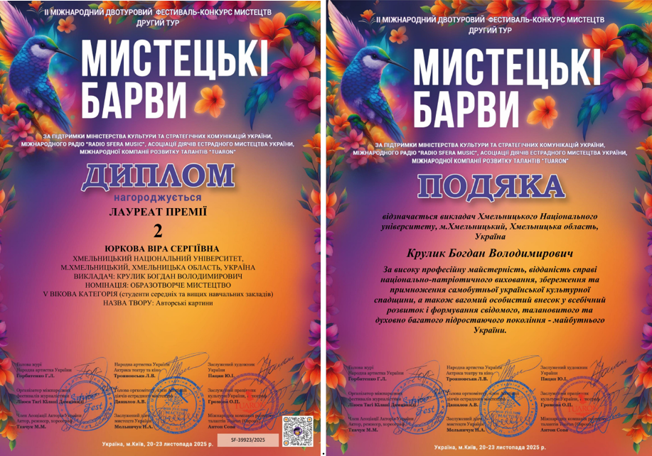 23 листопада 2025 року було підведено підсумки другого туру ІІ Міжнародному двотуровому фестивалі-конкурсі мистецтв “Мистецькі барви”, м. Київ.