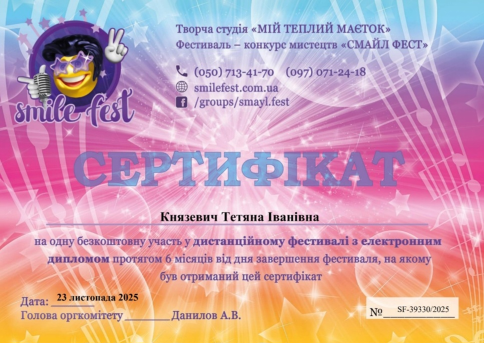 Також за умовами конкурсу студентка Князевич Тетяна отримала сертифікат на одну безкоштовну участь у дистанційному фестивалі протягом 6 місяців.