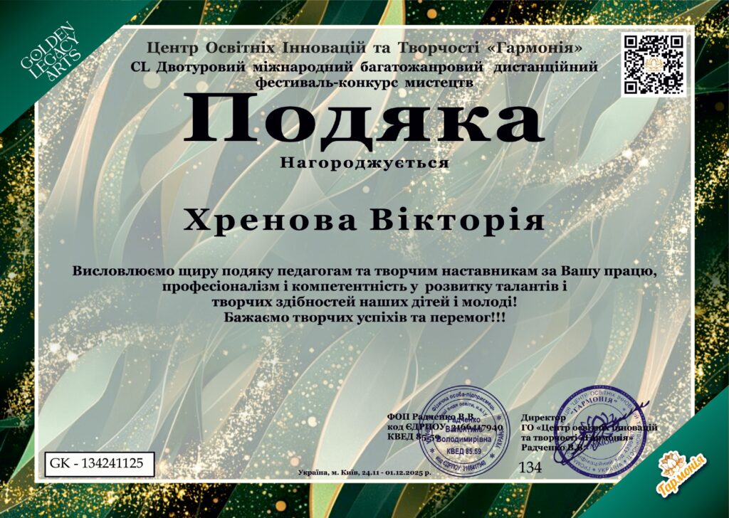 Центр освітніх інновацій та творчості “Гармонія” провів міжнародний багатожанровий фестиваль-конкурс мистецтв “GOLDEN LEGACY ARTS”. 01.12.2025 року були оприлюднені результати конкурсу. Студенти, які навчаються за ОПП “Середня освіта. Трудове навчання та технології, інформатика”, “Середня освіта. Технології та інформатика першого (бакалаврського) та другого (магістерського) рівнів вищої освіти гідно представили кафедру на конкурсі та отримали заслужені нагороди: