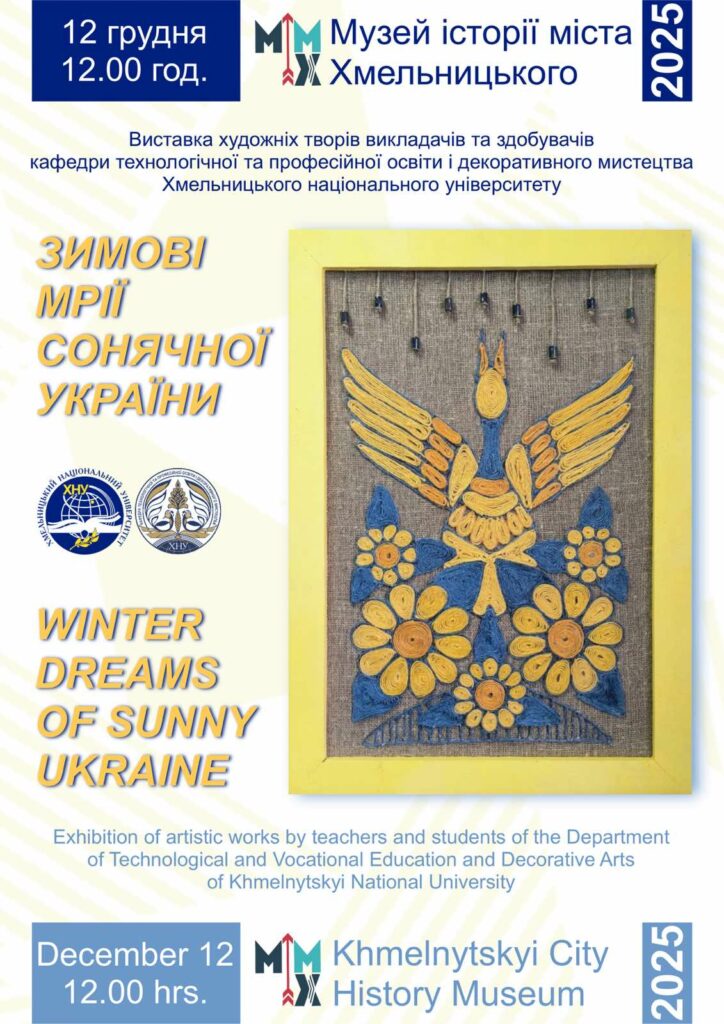 12 грудня 2025 року о 12.00 у Музеї історії міста Хмельницького відбудеться відкриття виставки художніх творів здобувачів та викладачів кафедри технологічної та професійної освіти і декоративного мистецтва Хмельницького національного університету «Зимові мрії сонячної України».