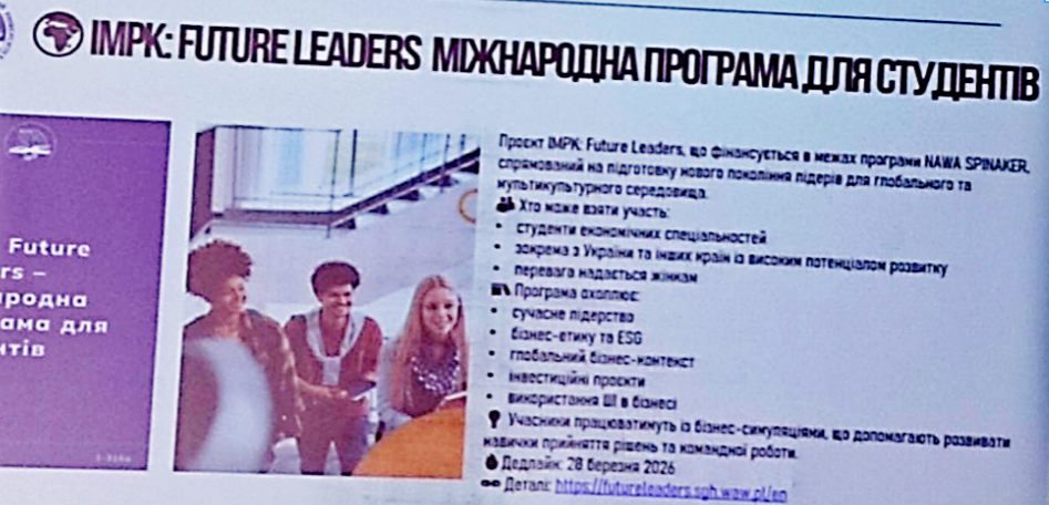 Була представлена програма Erasmus+, яка забезпечує повне занурення в освітнє середовище іншої країни (Польщі, Литві, Німеччині, Іспанії тощо) та має стипендіальну підтримку.